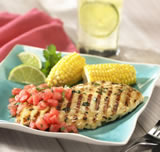 With meat mallet or other flattening utensil, pound chicken breasts to 1/2-inch thickness. In small bowl, whisk together lime juice, oil, parsley, oregano, thyme, garlic, salt and pepper. Place chicken in a sealable plastic bag; add lime juice mixture. Seal bag and turn until chicken is well coated. Chill 30 minutes or up to 4 hours. Spray grate of grill with cooking spray. Heat grill to 400° F. Place chicken on grate and cook, 6 minutes per side or until chicken is cooked through (165° F). Serve with Watermelon Salsa. Watermelon Salsa