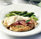 With meat mallet or similar utensil, pound chicken breasts to 1/4-inch thickness. In shallow dish, mix together flour, pepper, and salt. Coat chicken with flour mixture. In large nonstick fry pan, place oil and heat to medium-high temperature. Add chicken, cook about 8 minutes, turning once, until chicken is brown. Reduce heat to medium-low and cook, covered, 5 minutes or until chicken is fork tender. Sprinkle Parmesan over chicken; top with chopped sage. Arrange 1 slice prosciutto, folded to fit, over each piece of chicken and top with 1 slice mozzarella cheese. Cover fry pan and cook 2 to 3 minutes or until cheese melts. Remove chicken to serving platter; keep warm. To drippings in same pan, add wine and lemon juice. Heat to boiling; boil 2 minutes or until sauce is reduced to about 1/4 cup. Spoon sauce over chicken cutlets. Garnish each portion with fresh sage leaf, if desired. Nutritional Information